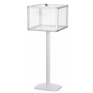 Nos modèles sur pied atteignent 90 à 120 cm de hauteur totale. Le pied en métal ou plexiglas assure une stabilité optimale. Selon retours de 23 exposants interrogés en 2024, le taux de participation aux jeux-concours augmente de 35 à 50% avec une urne sur pied versus une urne posée sur comptoir. Prix : de 140€ HT à 350€ HT selon finitions.
