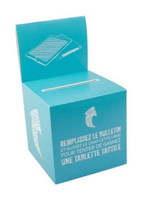 Recommandation : urne plexiglas transparente avec porte-visuel intégré pour afficher règlement et lots à gagner. Budget : 30-65€ HT.