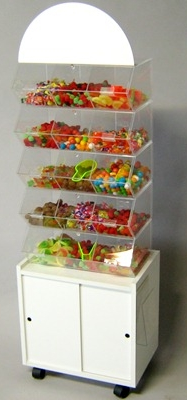 Le meuble 10 coffrets ALIM420 est un meuble à roulettes avec 2 portes (réserve), avec fronton supérieur en coloris bois avec possibilité de poser un adhésif (personnalisable en option) à coller sur la partie supérieure. Le meuble 10 coffrets ALIM420 permet de superposer 5 distributeurs sur 2 étages (10 distributeurs au total) de diamètre 12 cm et 30 cm de haut (5 litres). Le meuble 10 coffrets ALIM420 a un format de L 670 x P 400 x H 1650 mm et est conçu pour une charge maximum de 80 kgs et peut être disposé en ilôt en mettant 2 exemplaires en dos a dos. Le meuble 10 coffrets ALIM420 peut-être utilisé pour les bonbons, fruits secs, biscuits secs, épices, cacahuètes, mais aussi accessoires bijoux fantaisies.... Le meuble 10 coffrets ALIM420 est vendu à partir de 1 seule pièce mais dispose de tarifs dégressifs par quantité Le meuble 10 coffrets ALIM420 avec les 10 distributeurs et couvercles à l'unité