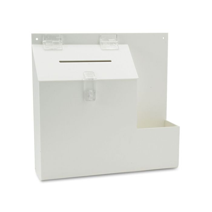 L'urne murale WHITE83 est une urne mur de coloris blanc avec un compartiment pour accueillir des documents A6 ou 1/3 A4 à coté avec fixation murale. Disposant d'une fente de 140x13 mm pour l'insertion des documents A6 ou 1/3 A4, l'urne murale WHITE83 cadenas est fournie avec un cadenas et 2 clés pour une fermeture plus sure ainsi que les vis de fixations murales. L'urne murale WHITE83 est réalisée en PMMA blanc et a pour dimensions totale : L 350 x H 360 x P 90 mm. L'urne murale WHITE83 à l'unité